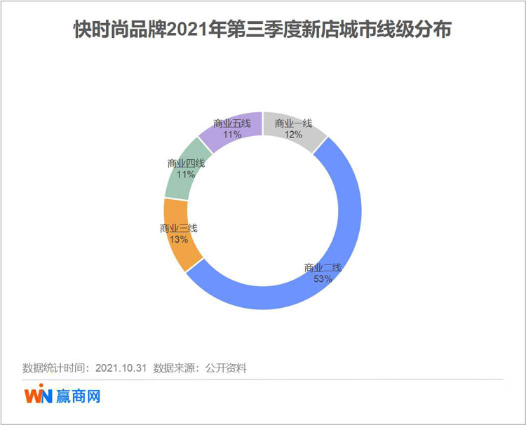 從分布的城市商業(yè)線級看,商業(yè)二線城市占了超過半市場,較上半年占比再提升4個百分點;其余的商業(yè)一線、三線、四線及五線城市新店數(shù)量相當(dāng),相差無幾。相比上半年,一、二、三線城市占比略有下滑,四、五線的低線級市場占比略有提升,與下沉市場迎來一批新開業(yè)項目,引入快時尚新店有一定關(guān)系。