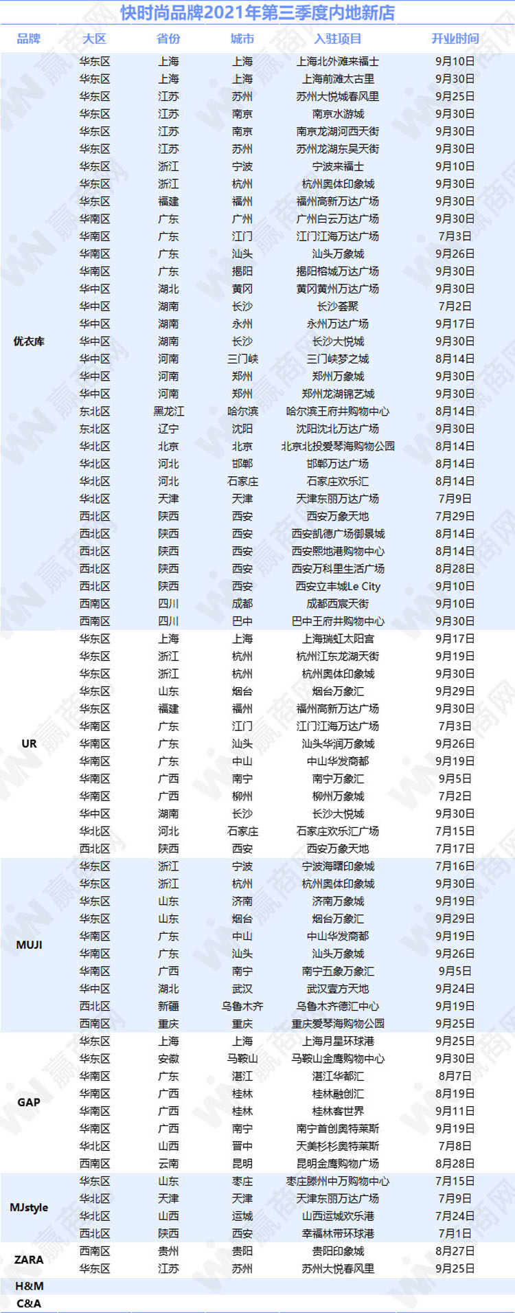 附表:快時尚品牌2021年第三季度內(nèi)地新店名單