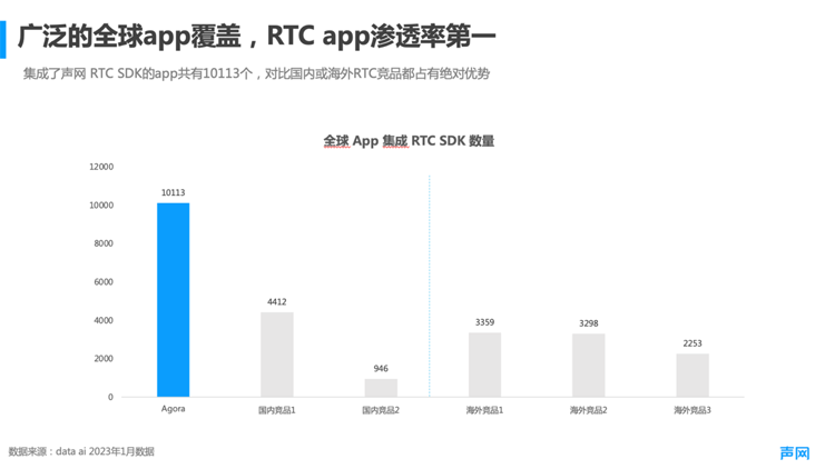 根據(jù)data.ai統(tǒng)計(jì)數(shù)據(jù)全球共有10113個(gè)App集成了聲網(wǎng)的SDK,在全球同類型競(jìng)品中優(yōu)勢(shì)明顯。