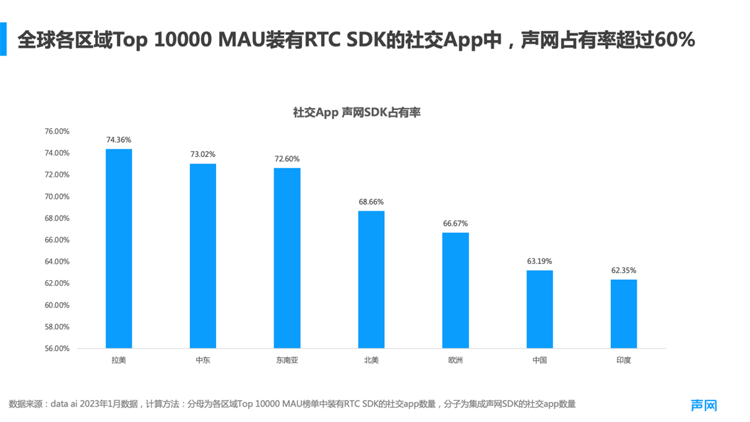而且值得注意的是,這些產(chǎn)品分布在北美、中東北非、東南亞、歐洲、日韓、拉美以及中國(guó)港澳臺(tái)等眾多市場(chǎng),作為數(shù)據(jù)支撐,在全球各區(qū)域Top10000MAU的裝有RTCSDK的社交App中,聲網(wǎng)占有率超過60%,在拉美、中東、東南亞等新興市場(chǎng)滲透率尤為深入。